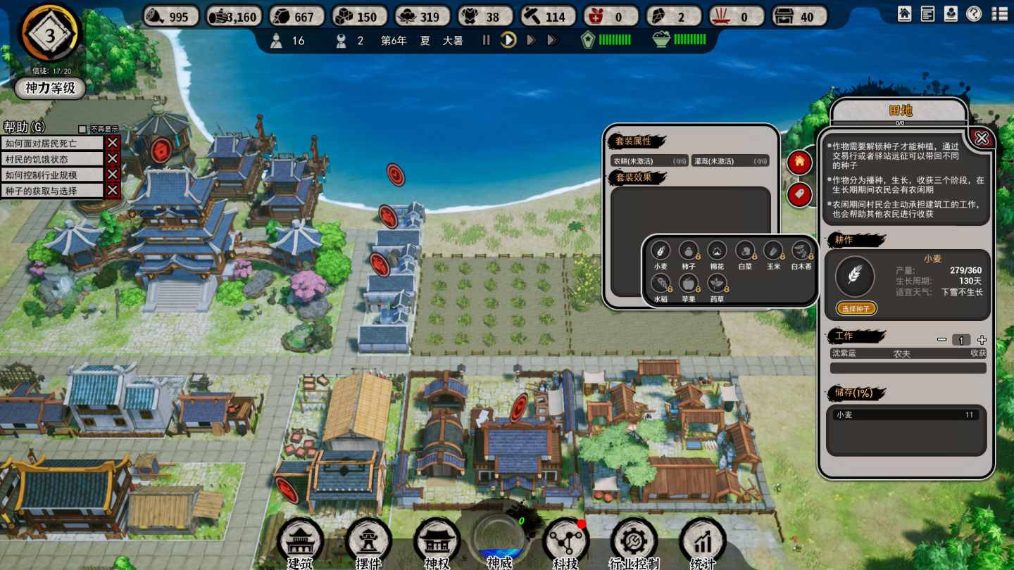 但問題是,本作的居民並沒有「滿意度」的設定,而是只有一個全局的「營養度」的設定。但是種子卻有相當多的種類,什麼小麥、水稻、蘋果、白菜…等等,有部分種子需要科技解鎖例如水稻和棉花,並且除了白菜以外的所有糧食作物都不會在下雪天氣生長。