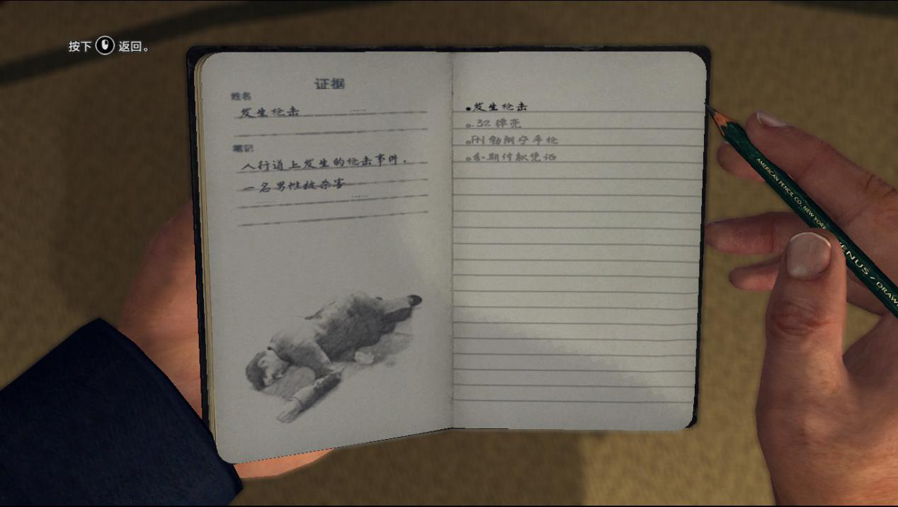同樣在遊戲中作為一個警探你要調查現場隱藏的蛛絲馬跡,喜歡看推理小說的朋友都知道很多線索都非常細微,所以遊戲在細節方面做得非常細。甚至需要玩家去發現桌角煙蒂上的紅唇印和屍體衣服上的洗衣標簽地址等細微的線索,或者是通過塗鉛去讀取某些殘存在紙上的信息。當玩家發現重大線索時,這些線索會被記錄在主角的小黑本上並在審問時起到很大的作用。
