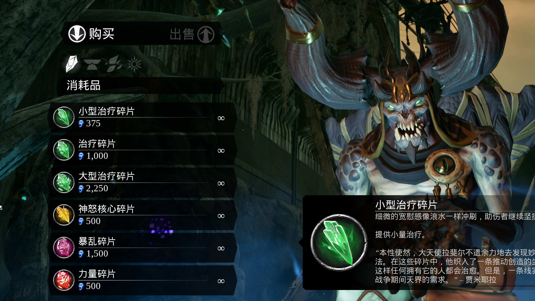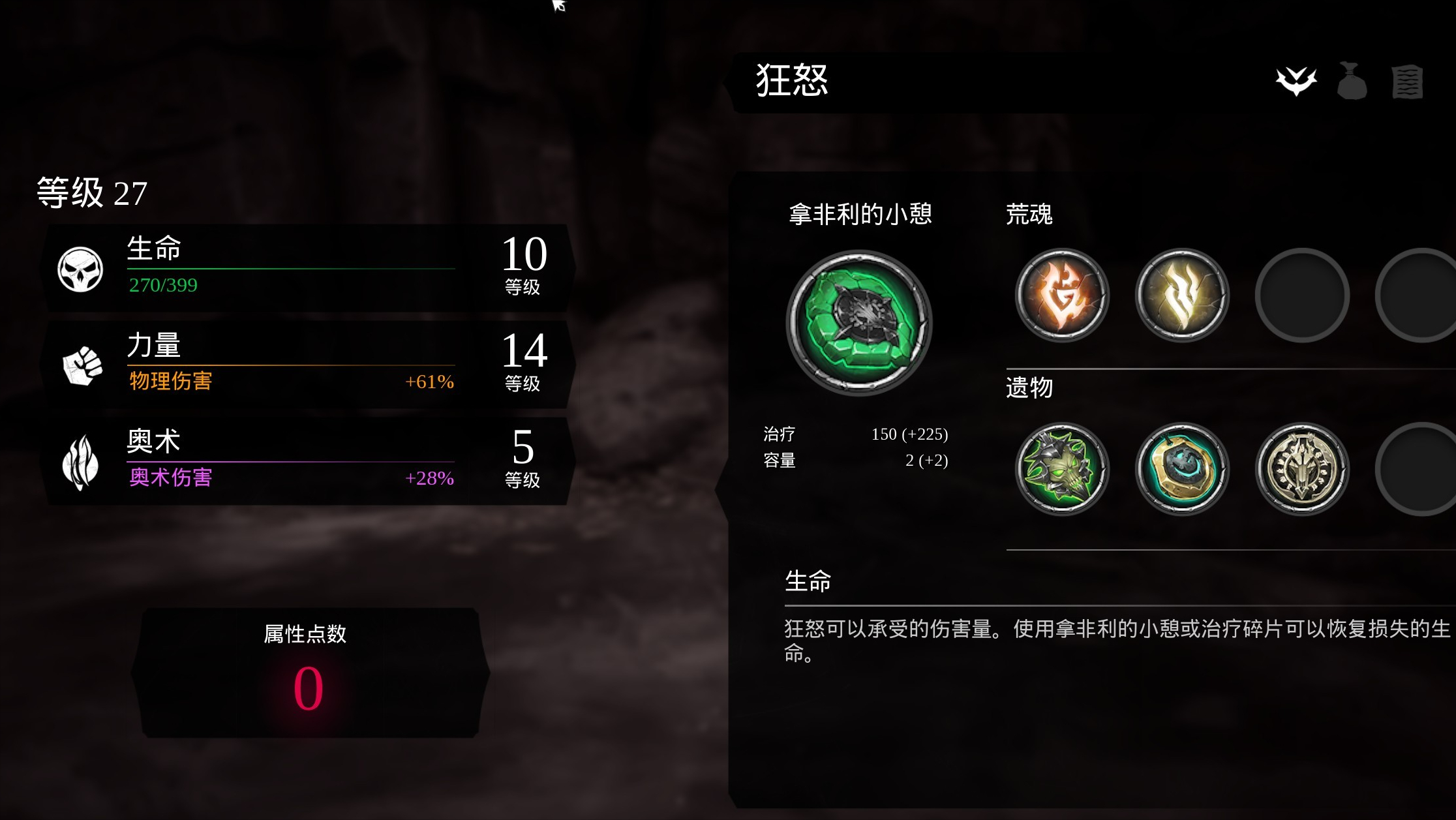 狂怒殺敵人之後會掉落藍魂、黃魂與綠魂三種竊魂,綠魂可以存儲進拿非利的小憩,黃魂可以補充神怒值,作為貨幣的藍魂則比較重要,不僅能夠從游戲中的奸商惡魔「弗格里穆」購買輔助道具,也是提升狂怒等級、獲取屬性點的主要來源。本作給狂怒設置了三項屬性設置,每一項的加點可以根據個人喜好進行添加,如果想要洗點重加,可以等至前進到每個新場景時,找到弗格里穆購買相應的洗點道具即可。