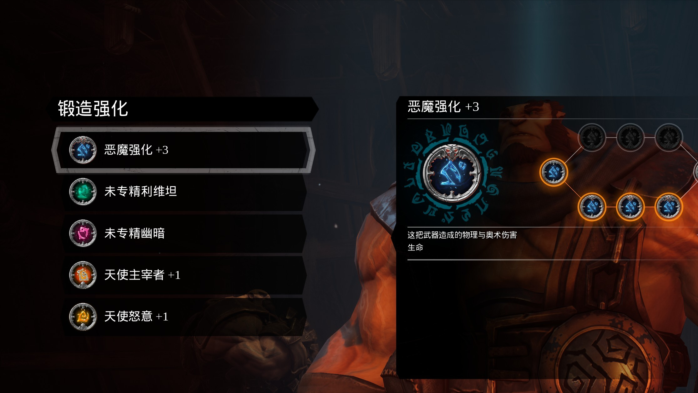 玩家可前往人類聚集地「造物者的熔爐」,通過「造物者」烏坦可以為狂怒地武器進行升級與強化,升級方面沒有太多的可選項。至於強化方面,玩家可以在每一個武器徽章上進行惡魔與天使兩個分支選擇,要注意的是一旦選擇了其中一項,則只能按照這一項的強化路線進行強化。故在強化與升級時請多結合個人實際使用狀況來進行舍取,畢竟這兩者所需的材料獲取還是比較難的,即便可以從弗格里穆處購入,花費大量的藍魂也是十分不劃算的。