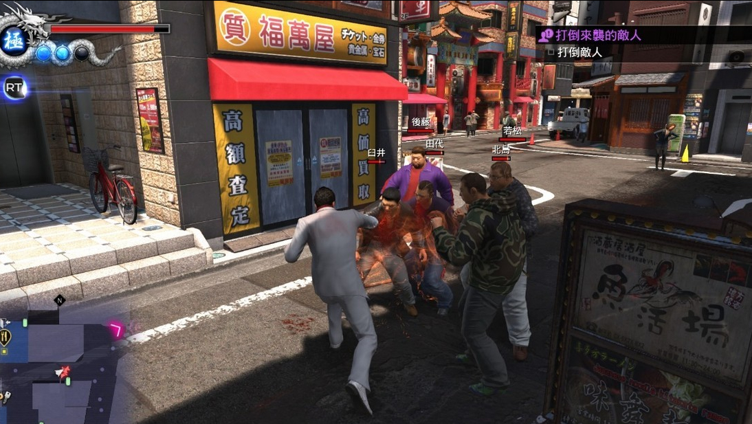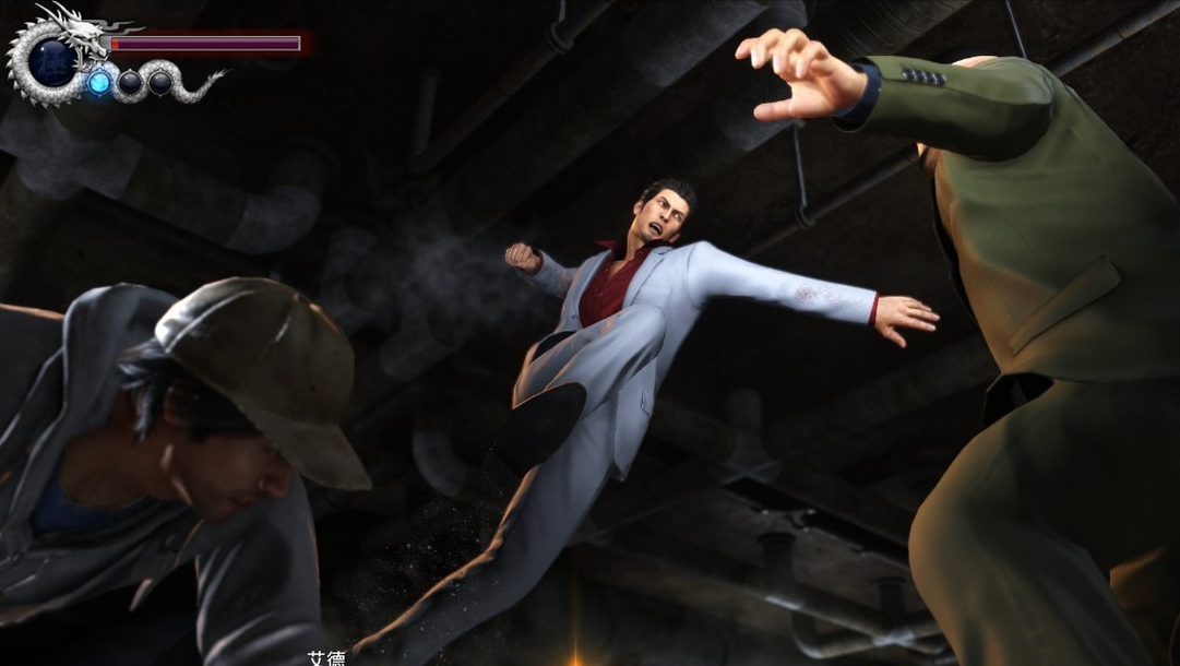敵人數量的增多對戰鬥的影響是質變性的,即使是桐生一馬這麼強的男人也沒法直接莽上去了——就算是普通難度下的雜兵傷害都讓人有些承受不住,再加上被攻擊後很容易造成硬直和倒地從而再受到後續傷害,因此HIT&RUN成為了玩家必須掌握的能力。雖然還是遇敵後進戰,但戰鬥場景相比此前要開闊了不少,給予了玩家足夠的閃躲空間。玩過魂系列遊戲的同學對這一套會很熟悉,只要不貪刀打幾下及時閃避拉開距離就好。此外玩家還需要善用究極熱血模式,按下手柄RT鍵後攻擊力得到提升、並能通過QTE削減敵人大量血量。