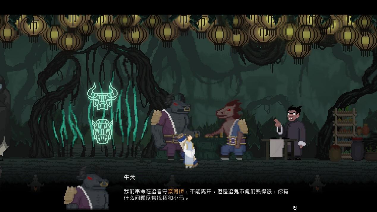本作採用了像素水墨畫的風格,簡約卻不簡陋,輕描淡寫的幾筆卻能夠生動形象地勾勒出人物的形態,憨態可掬的黑無常、充滿童趣的琵琶鬼、愛夫情深的葉瑛等,都給我留下深刻的印象。除了人物形象,環境氛圍的營造也相當不錯。通過本作,你能看到在民間志怪故事中的黃泉、奈何橋、三生石,還有枯寂破敗的蘆石村,有種江南水鄉美感的花溪村,雲霧繚繞的仙山,陰森恐怖的妖洞。尤其時當你穿梭於過去與現在時,那種同一個地點的物是人非、今昔非比所帶來的的巨大反差,不僅一番感慨,也增強了玩家的沉浸感。