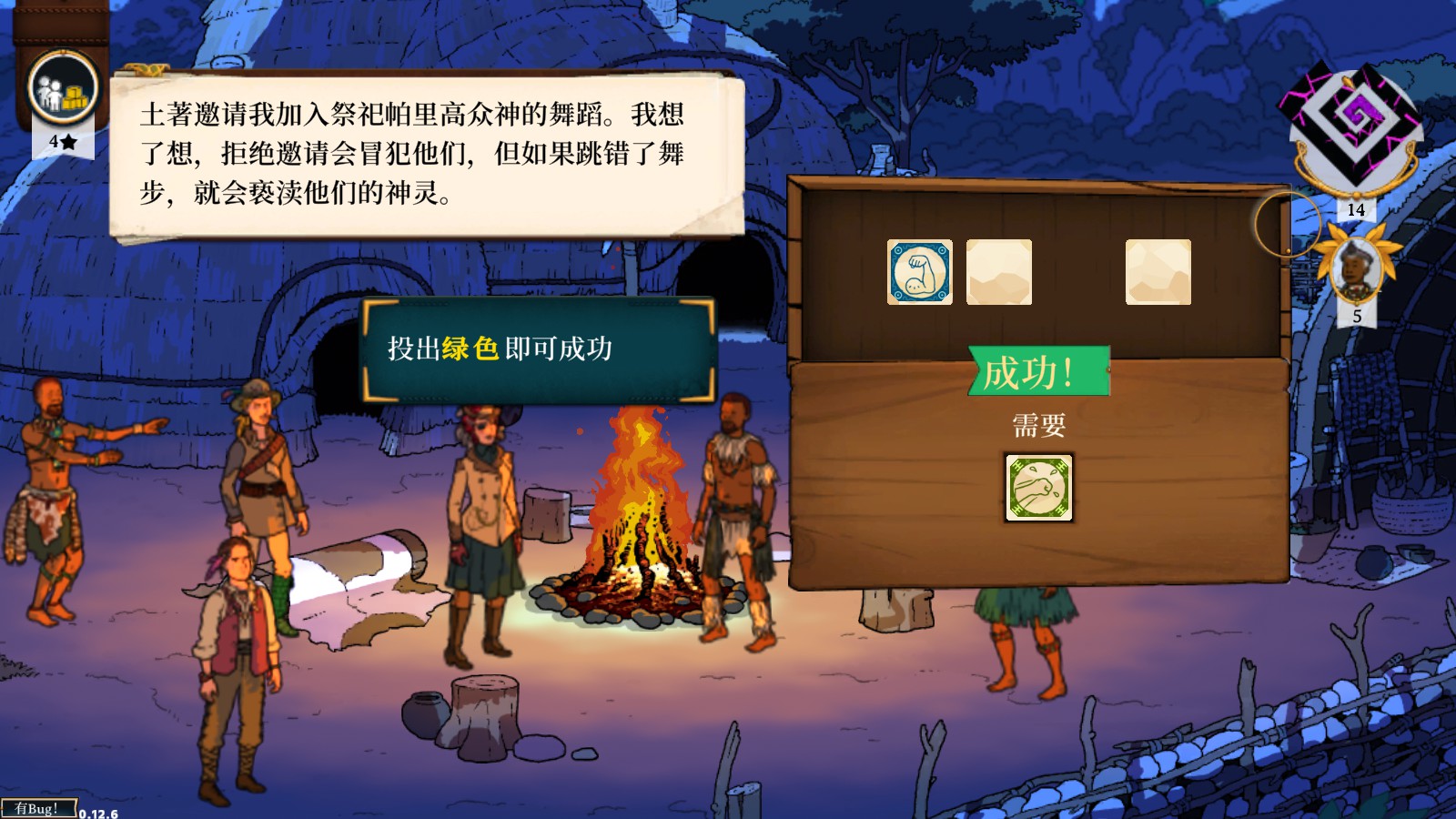 有的事件是需要戰斗的,比如玩家遇到前來搶財寶搞破壞的冤家仇敵,或者是為了幫助酋長而去除掉威脅部落安全的猛獸。戰斗的機制比較看臉,應該是脫胎於跑團類桌游(TRPG)。對戰雙方為回合制輪流行動,玩家一方在攻擊時需要擲骰子,根據擲骰子的結果進行相應的行動,比如攻擊、給隊友加BUFF、給敵人加DEBUFF,本回合做什麼,就看骰子能擲出什麼。相同的骰子可以疊加效果,讓本次的攻擊或者BUFF更有威力。骰子不是每一面都有行動,有的時候會擲出空白面,那就是什麼動作也沒有的意思,不過「非酋玩家」對此也不用太慌,每個回合玩家都有一次重新擲骰子的機會,不會讓玩家空過一個回合。探險團隊里的隊友有職業之分,不同的職業有不同的擅長領域,比如士兵在戰斗中如果裝備了槍類武器則會有更厲害的輸出,教士類的輔助職業則可以為隊友提供治療或者防護。探險前招募人員的時候考慮到職業的互補就可以了,還是比較好理解的。