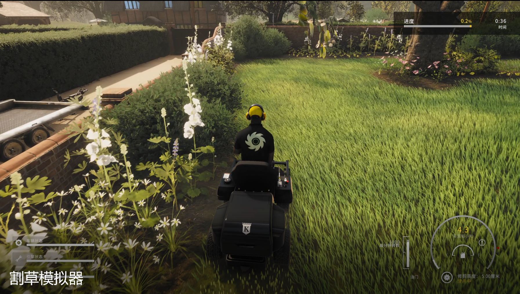 在遊戲中,一個割草機的啟動到投入工作,你需要:發動引擎->加大油門->調整修剪高度->啟動修剪刀片