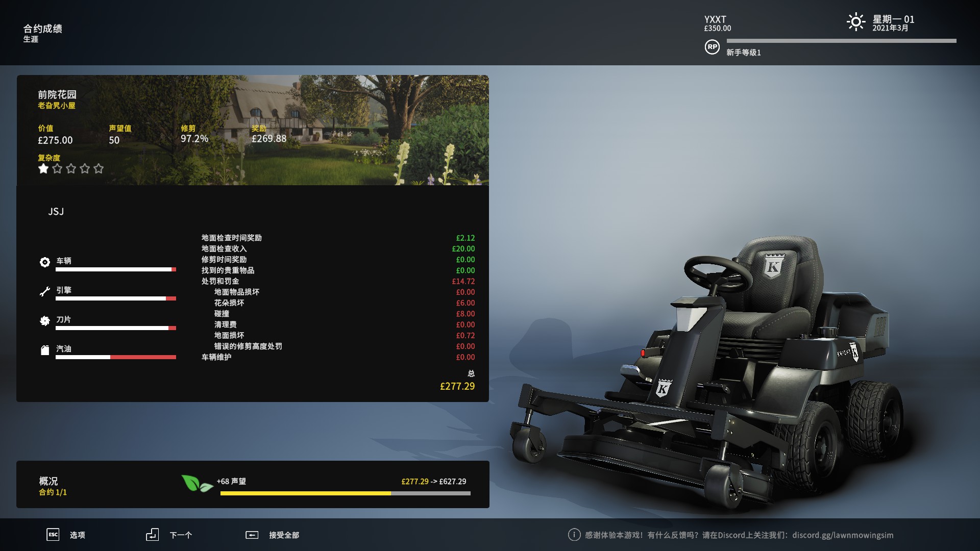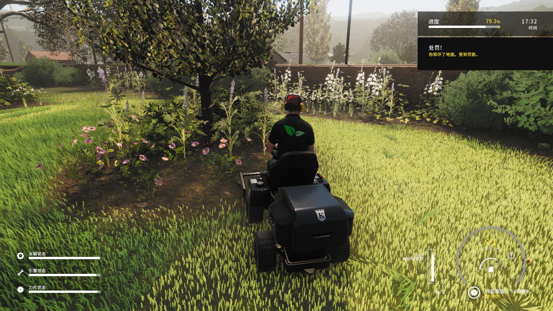 其實,以真實的物理特性為基礎的遊戲,操作起來都是有一定門檻的,如果操作不當的話就很容易完成沙雕遊戲。在本作中,玩家駕駛割草機的手感坦白地講並不是很好掌握,開起來之後有一種滑溜溜的感覺,就像現實中新手學車時的手感一樣,以至於新手引導中的「將割草機倒回拖車處」這個環節差點被我玩成了「倒車入庫模擬器」。在割草的過程中最好放慢速度,一方面是因為割草機不能開太快,太快的話會導致割草機引擎不必要的損耗;另一方面是因為開太快的話會導致割草效果不好,有些邊邊角角的地方只有慢慢修剪才行,而且還不能碰壞不必修剪的花草,否則會在任務結算時被處罰。當然了,如果是操作非常厲害的高手應該是可以做到又快又好的,畢竟遊戲模式里就有挑戰完成時間的玩法。