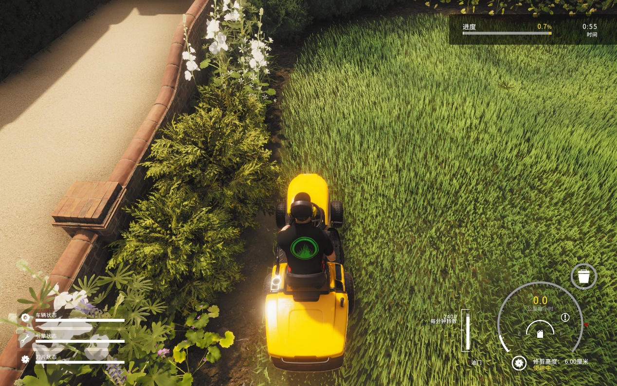 遊戲操作也算是比較簡單的,幾個按鍵就能玩,而且正常遊戲中也會出現按鍵提示,拯救玩家的七秒記憶。視角有第一第三人稱等,可以坐在割草機上也可以下車步行。而且這些視角在玩家遊戲過程中都會起到作用。(第一人稱易於檢查哪裡沒割干凈,第三人稱易於防止損傷到主人院里種的其他植物)
