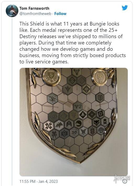 Farnsworth向我們展示了一個布滿了獎章的裝飾性盾牌,每一個獎章都代表了《命運》所發布的內容。