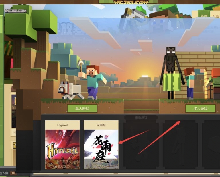 1、首先,打開我的世界啟動器,雙擊圖標即可,進入之後,點擊啟動器右下角的「啟動遊戲」。左邊是單人遊戲,右邊是多人遊戲,花雨庭是一個伺服器,所以我們要選多人遊戲,點擊即可進入。