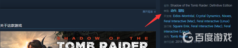 古墓麗影:暗影是一款動作冒險類遊戲。玩家在steam商城搜索該遊戲後點擊進入,可以在遊戲介紹界面看到這款遊戲類型,如下圖所示,該遊戲已於2018年9月14日發行上線。