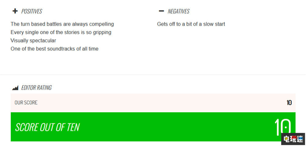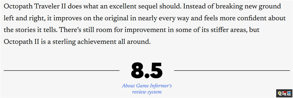 《歧路旅人2》是前作得意與自信的續作,遊戲在既定的基礎之上創建了受歡迎的新機制與調整,從而帶來了出色的完整體驗。充滿戰術的戰斗系統、開放式的遊戲流程、精心刻畫的故事、華麗的視覺效果以及難以置信的配樂融合成了迄今為止Switch上最好的RPG。雖然與前作大同小異,但是淺野組在每個改動上都展現了精緻的技藝。