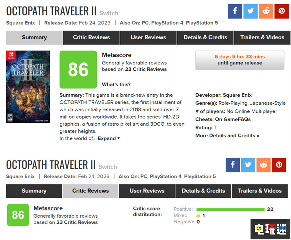 《歧路旅人2》雖然還要等到下周才發售,但是本作的全球媒體評分也已解禁。截至目前(2月17日),Metacritic上的媒體平均分為86分,目前一共收錄了23家評分,其中22家給出了好評,1家給出了中評,目前沒有差評。大多數認為《歧路旅人2》依舊是一款在HD-2D加持下講好故事的王道JRPG。