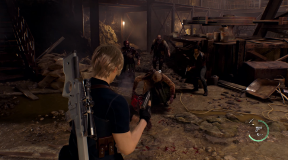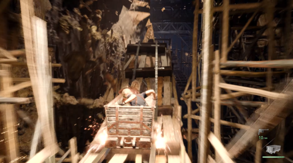 視頻中,我們看到十八般武藝的里昂又回來了,架斧頭,躲觸手,K BOSS,騎礦車,炸木桶,還一槍射中了一位老太太的膝蓋(持電鋸揮舞而來)。