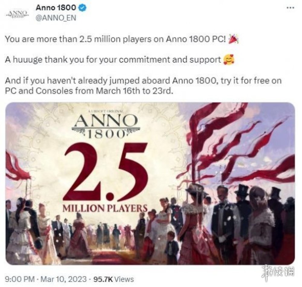策略遊戲《紀元1800(Anno 1800)》官方推特今日(3月11日)發文宣佈本作玩家數量現已突破250萬,並同時公佈了賀圖。