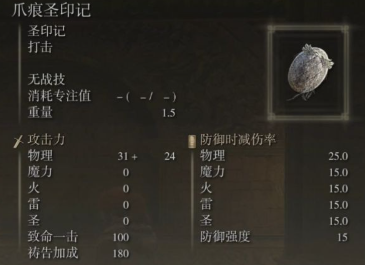 爪痕聖印記沒有什麼戰技,也不消耗專注值,佩戴 後能夠加強物理攻擊,並且在防禦時在魔力並且各個屬性下都有增強,詳細屬性如下。