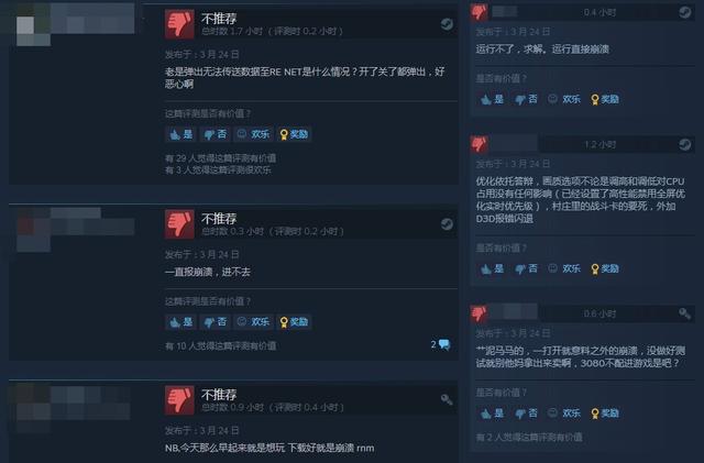 而給出差評的玩家則認為“遊戲似乎仍有一些Bug存在”“執行直接崩潰了”“一直顯示有錯誤發生,進不去遊戲”“一開啟遊戲就崩潰,3080不配進遊戲是吧?”