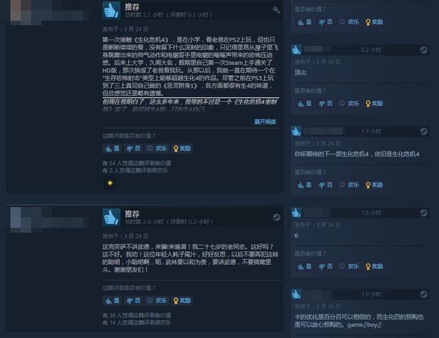 給出好評的玩家表示“能超越《生化4》的只有《生化4》自己”“你所期待的下一步生化危機4,依舊是生化危機4”“非常棒,期待已久。希望能重製維羅妮卡”。