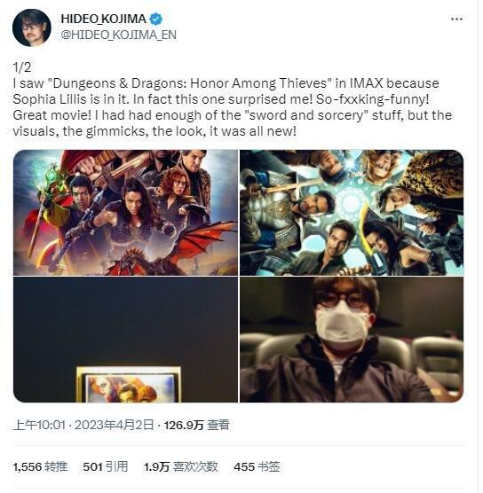 小島秀夫在推特上表示,自己去看了《龍與地下城:俠盜榮耀》:我看了IMAX版的!因為索菲亞·莉莉絲在裡面出演了。這部著實驚豔到我了!Fxxk太有趣了!很棒的電影!我本已經受夠了“劍與魔法”這類東西,但這部的視效、噱頭和造型看起來都很新穎!多立克變身時逃走的一個鏡頭超級棒!