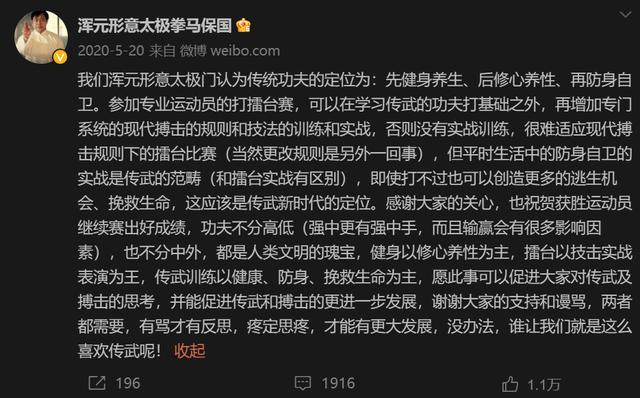 在這場比賽後,馬保國的微博所用的口吻是“傳統功夫應當先健身養生、修心養性,而後才是防身自衛”。