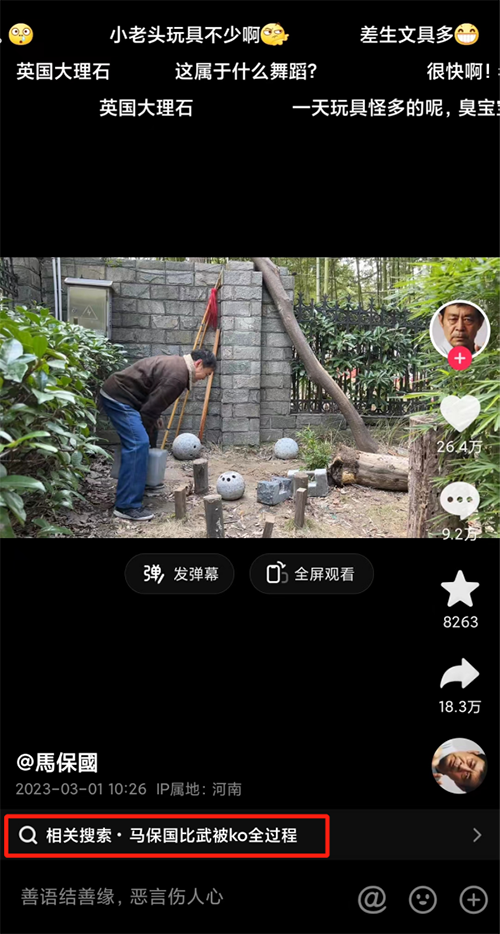 雖然在很多他的視訊中,底下的相關視訊搜尋推薦,永遠是“馬保國比武被KO全過程”,在馬保國的視訊評論區中,也充斥著一味玩梗的網友。