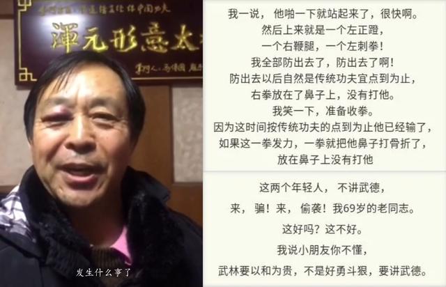 在他的第一個視訊裡,他放棄了當初一貫堅持的大師,技擊水平出色等等人設,不再嘴硬,也不再逞強,只一味地強調自己今年已經七十多歲了,承認了可能不如年輕人快,不如年輕人能打,但在這個年齡能夠有這樣的狀態,已經很不容易了。