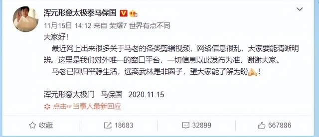 2020年11月15日,馬保國經過官方微博宣佈遠離武林,迴歸平靜生活。