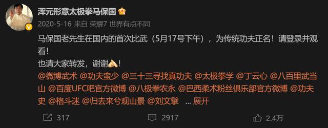 在這場比賽前,馬保國微博所用的口吻是“為傳統功夫正名。”