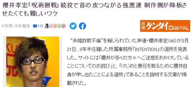 著名聲優櫻井孝巨集(48歲)不久之前鬧出婚姻隱瞞並出軌醜聞後,引發聲優界震盪,現在已經失去了多個工作,然而預定7月開播的超火爆動畫《咒術回戰》第二季仍然出演人氣角色夏油傑。