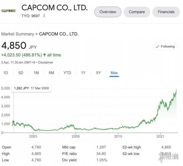 卡普空股價和市值近年來一路飆升,目前已破萬億日元(1.29萬億日元),現在其市值在日本本土的遊戲廠商中僅次於任天堂(6.72萬億日元)和萬代南夢宮(1.94萬億日元)。