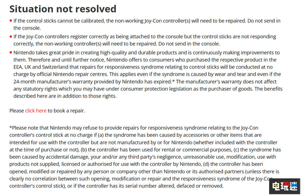 任天堂官方表示直到另行通知為止,任天堂不會向歐洲經濟區、英國以及瑞士使用者收取Joy-Con手柄的維修費用,無論是由於缺陷還是磨損造成的損傷。不過如果是由於第三方配件、意外損壞以及使用者自行開啟手柄維修導致的故障,任天堂將不提供免費維修。
