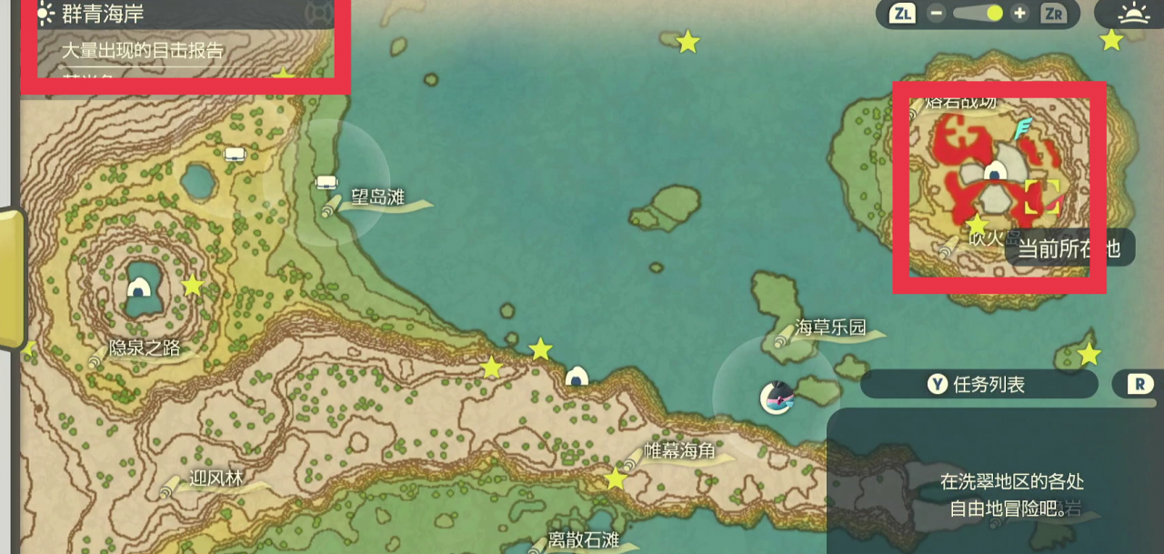 首頁 寶可夢傳說:阿爾宙斯 問答 寶可夢傳說:阿爾宙斯鴨嘴寶寶在哪抓? 2022-07-01 1.首先在群青海岸的地圖上找到吹火島,然後點擊吹火島進入。2.進入吹火島後,在火山附近就可以看到鴨嘴寶寶,然後就可以進行捕捉。