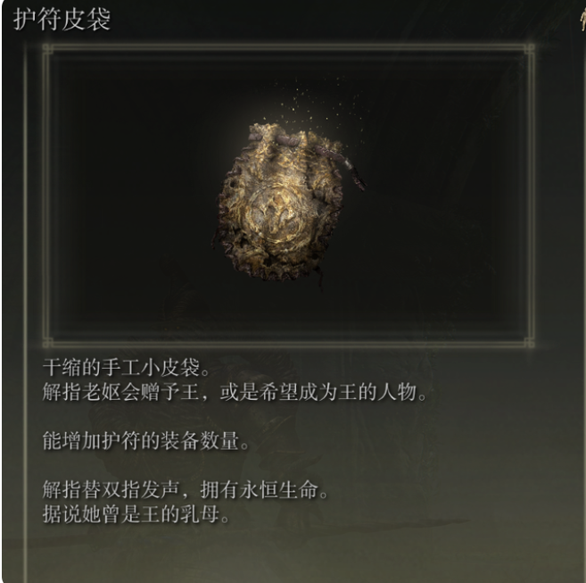 老頭環里玩家初始時候可以佩戴2個護符,在置物包-貴重物品選項里玩家可以找到名為護符皮袋的道具。打完噩兆給一個,打完女王拿到第二個大盧恩去圓桌找二指旁邊的老婆婆會再給你一個,這樣就能裝5個護符了.