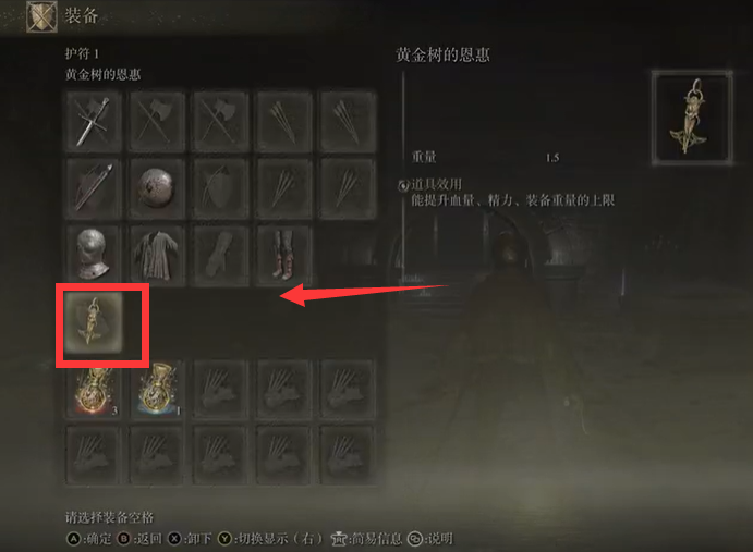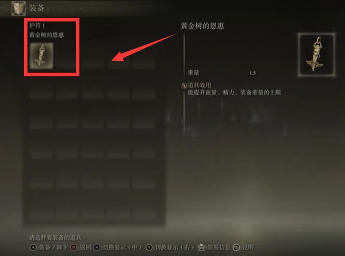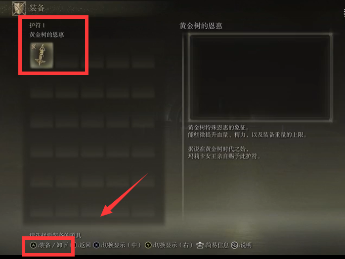 首頁 艾爾登法環 問答 艾爾登法環黃金樹的恩惠怎麼裝備? 2022-08-02 1、首先進入遊戲後,按esc打開頁面選擇然後選擇裝備。2、再點擊如圖下的位置。3、點開後就能看到黃金樹的恩惠。4、再點擊A就能將黃金樹的恩惠裝備上。5、最後可以看到黃金樹的恩惠被裝備上了。