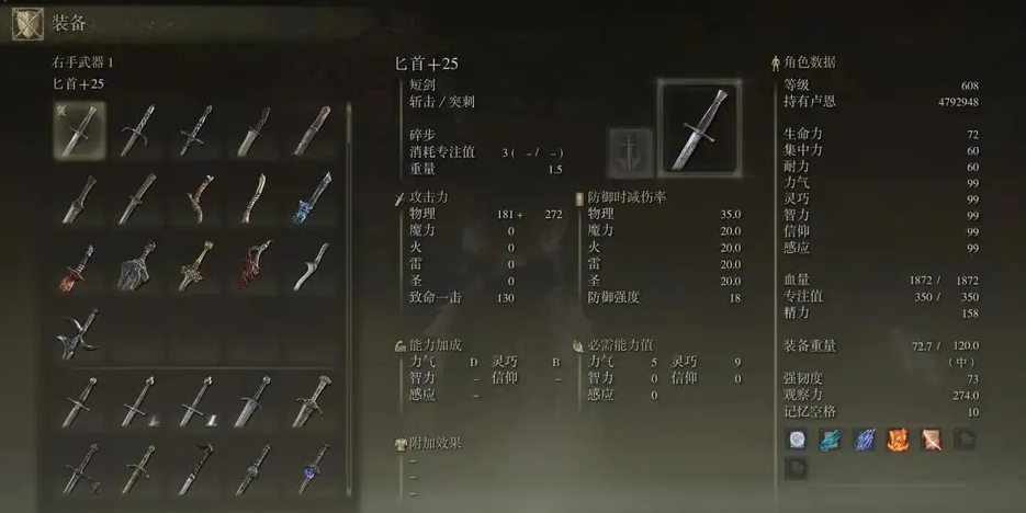 1、匕首,魂系列的老牌武器了,屬性和以前的也差不多,130的處決倍率,一般的面板,碎步的戰技。匕首強就強在還可以的面板以及130的處決倍率,但是本作彈反都需要多次,處決傷害也沒有很高,因此本作匕首不是很吃香,一般配合背後處決和彈反後處決,難以替代的處決武器,必備之一。