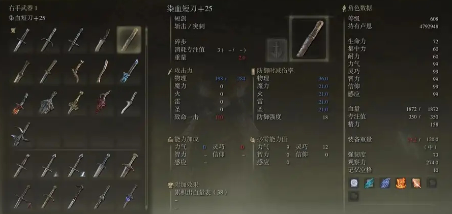 2、染血短刀,單刃小刀的上位替代,與之不一樣的是它吃力量,單刃吃靈巧。面板更高,其他大致相似,面板完全碾壓,無論是基礎屬性還是成長性,拿這把武器的也是單刃小刀主人的頭頭。評分略高,個人真的挺喜歡這種小隻出血的,靈活,缺點是獲取途徑困難,推薦。