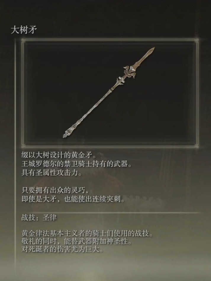 武器在利耶尼亞大道拉車怪的車裡面,戰技還是挺帥,可以附魔武器,喜歡長矛的玩家可以試試,前中後期都能用,具有122物理傷害的武器,適合戰士使用。