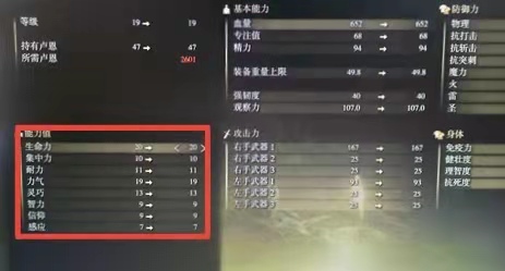 2.接下來是魔法騎士的加點,給魔法騎士的各個屬性合適加點也有利於玩好魔法騎士流。首先把【生命】點到【 20】,這樣能提高容錯率,生命足夠高打BOSS也能堅持久一些,前中期生命20足矣。接著把【集中力】點到【10】,再是力氣點到【19】,下面幾項屬性不變即可。綜上,玩好魔法騎士流玩家需要合理配備武器和加點。