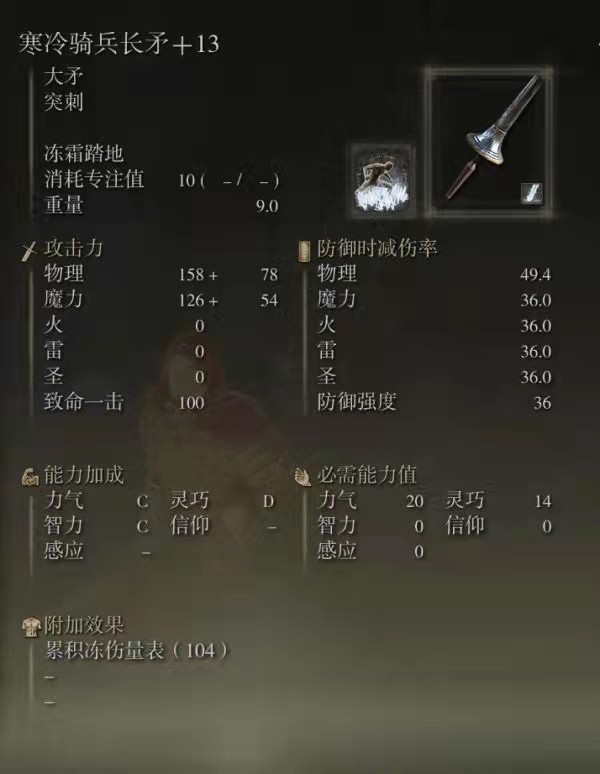 1.玩家在艾爾登法環游戲中想要玩好魔法騎士流,首先需要給魔法騎士進行武器選擇:武器選擇』『騎兵長矛』『。前期先拿隕石杖岩石球那一套,法師前期過渡,智力不用加太高,30左右就好。然後就可以主加力量;敏捷加到能拿武器就行。矛類武器攻擊模組少有橫掃動作,推圖時候面對群怪容易捉襟見肘,而冰質變可以讓武器獲得智力加成,如圖所示寒冷騎兵長矛的力智加成都有C,還算不錯。』『騎兵長矛』『本身的削韌也不低,很容易打出處決。是一個十分適合魔法騎士流的武器。