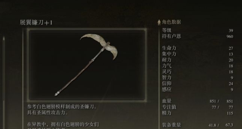 十分好用,整了個40級信仰壓級號入侵,用上了 1的展翼鐮刀,穿盾出血禁療,戰技還自帶飛天大位移,一打二也完全不在話下,屬性如下圖所示。