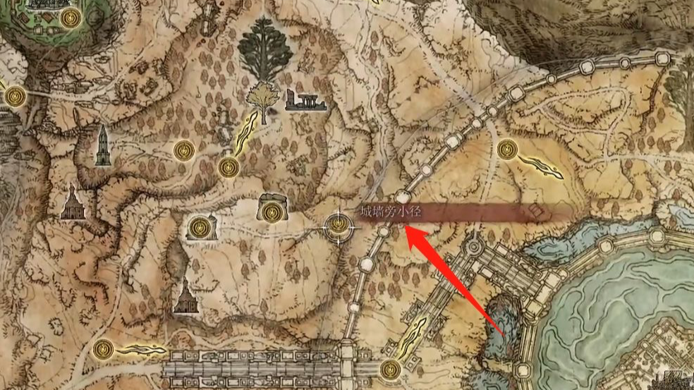 1:首先打開地圖,到達城牆旁小徑附近圖示的地點
