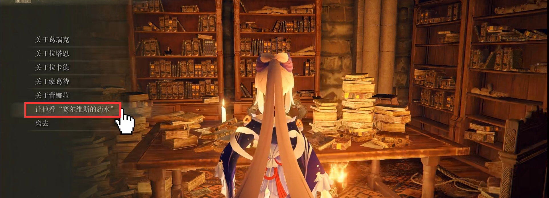 首頁 艾爾登法環 問答 老頭環怎麼把藥水給百智爵士? 2022-08-11 1.首先和賽爾維斯對話取得賽爾維斯的藥水。2.然後找到百智爵士點擊對話裡面的詢問涅斐麗沮喪的原因。3.再次對話即可出現讓他看「賽爾維斯的藥水」的選項。4.選擇交出賽爾維斯的藥水即可將藥水交給百智爵士。