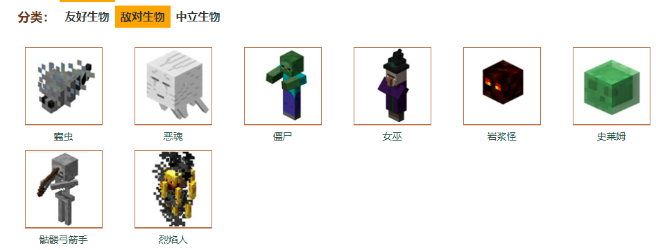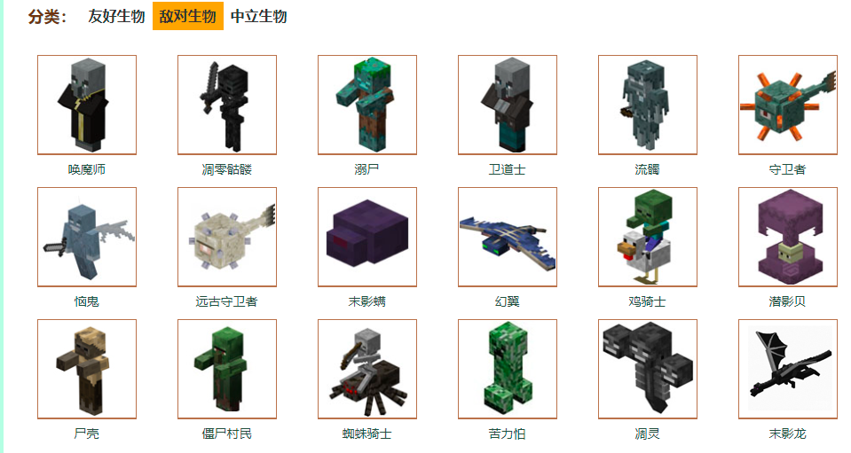 首頁 我的世界 問答 我的世界34種敵對生物有哪些? 2022-08-19 敵對生物有:喚魔師,凋零骷髏,溺屍,衛道士,流髑,守衛者,惱鬼,遠古守衛者,末影蟎,幻翼,雞騎士,潛影貝,屍殼,殭屍村民,蜘蛛騎士,苦力怕,凋靈,末影龍,蟲蟲,惡魂,殭屍,女巫,岩漿怪,史萊姆,骷髏弓箭手,烈焰人。