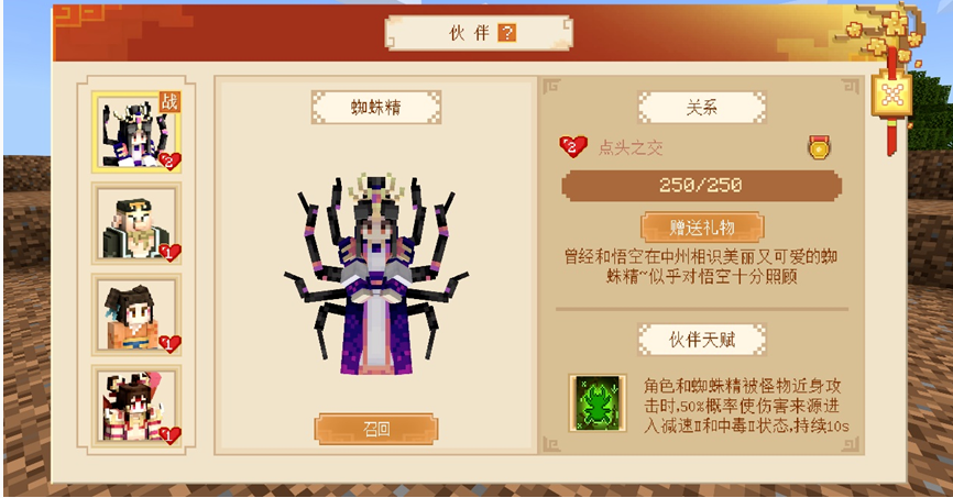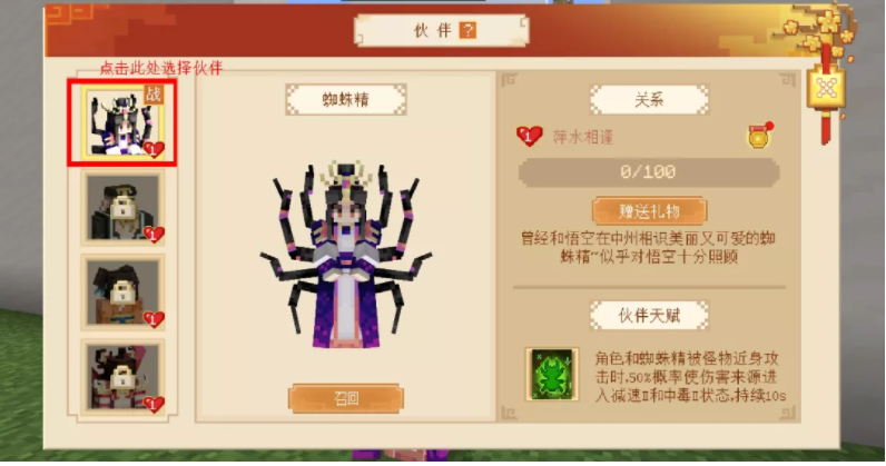 冒險路上當然少不了夥伴的助力啦,解鎖劇情即可召喚蜘蛛精、豬八戒等冒險家們熟悉的西遊角色夥伴助力你擊敗妖魔!所召喚的夥伴出戰時,能夠提供相應的特殊效果,而且向夥伴贈送禮物不僅可以提升好感度,還有幾率獲得神秘回禮哦~