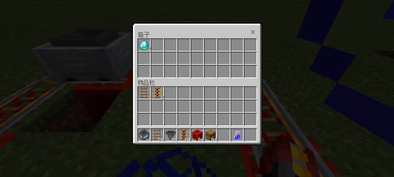 2、在漏斗礦車到到目的地時,在漏斗礦車下方放置一個漏斗,(不然無法打開箱子,或無法放置)在漏斗下再放個箱子,漏斗礦車中的物品就會到箱子裡面去。