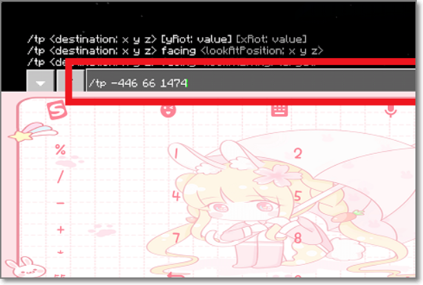 4,重新打開命令框,輸入並且發送第二條指令【/tp x坐標 y坐標 z坐標】(按剛才記錄下來的坐標填寫,高度大概填個70差不多是在地面)。