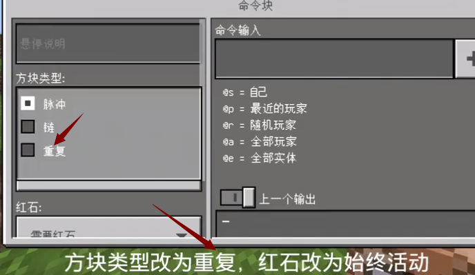 2,方塊類型改為重複,紅石改為始終活動