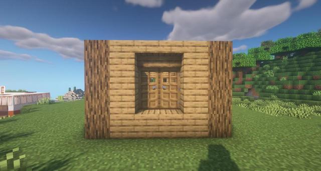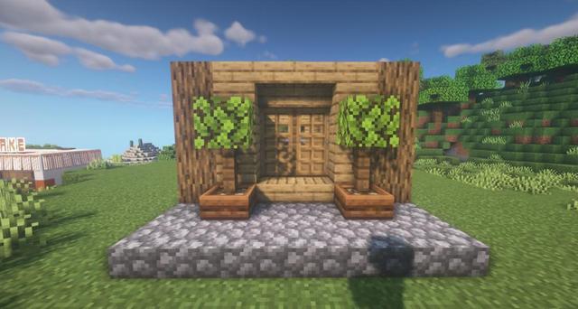 6.正面放上兩扇橡木門,將門上的橡木木板換成橡木台階。