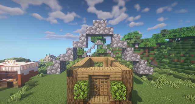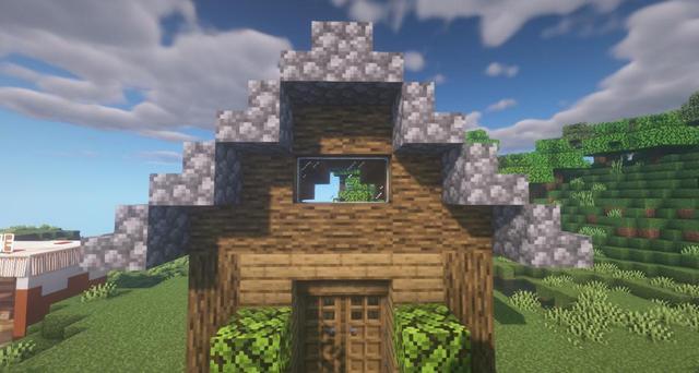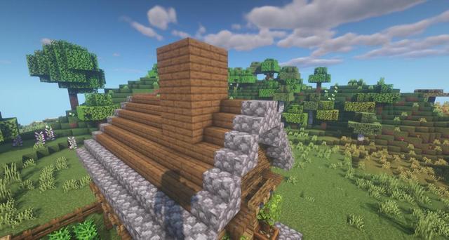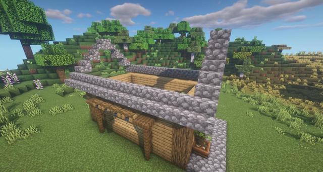 8.地面鋪上圓石台階。用圓石樓梯搭出屋頂形狀。