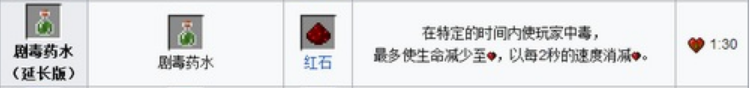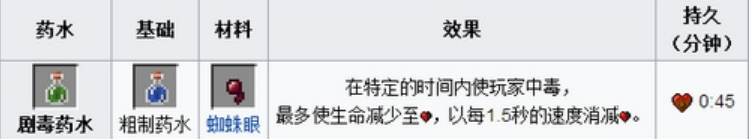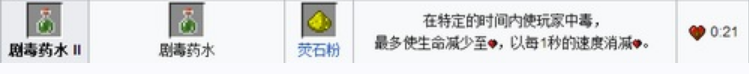 18.劇毒藥水Ⅱ=粗製藥水 蜘蛛眼 螢石粉(0:21)(特定的時間內使玩家中毒,以每1秒減半顆心的速度,直到剩半顆心將不再減)