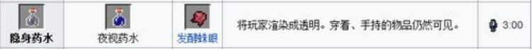 10.隱身藥水=粗製藥水 金蘿蔔 發酵蛛眼(3:00)將玩家變成透明,但是穿著和手持物仍然可以看見