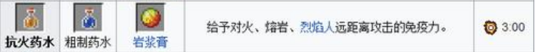 2.抗火藥水=粗製藥水 岩漿膏(3:00)有效時間內對火、熔岩、烈焰人火球等免疫傷害